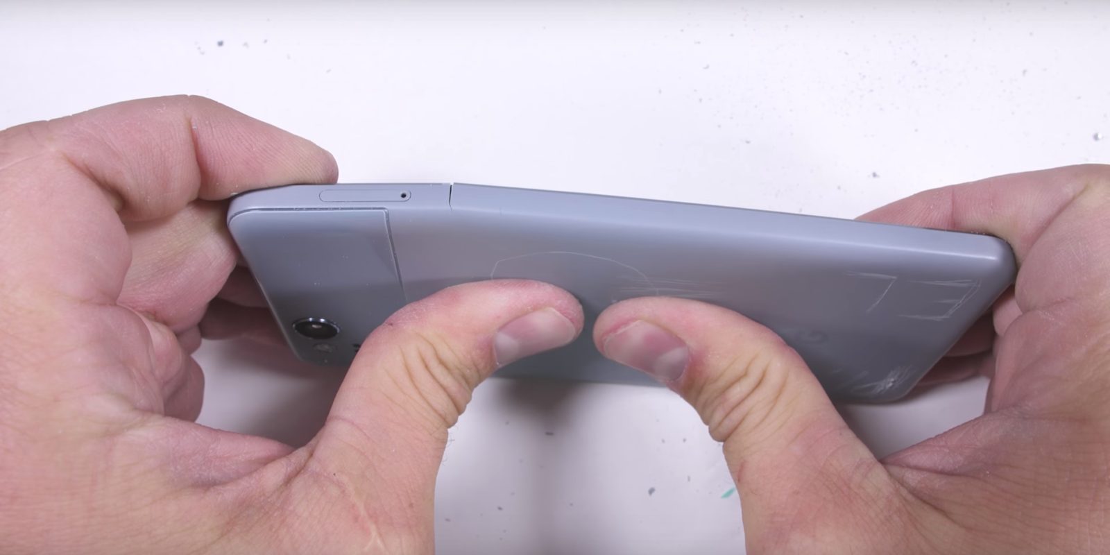 Jerry also bends the handset in half and found that the back casing snaps where the metal/plastic coating meets an antenna line. Besides the structural damage done to the Pixel 2, this renders the phone no longer IP67 dust and water resistant.