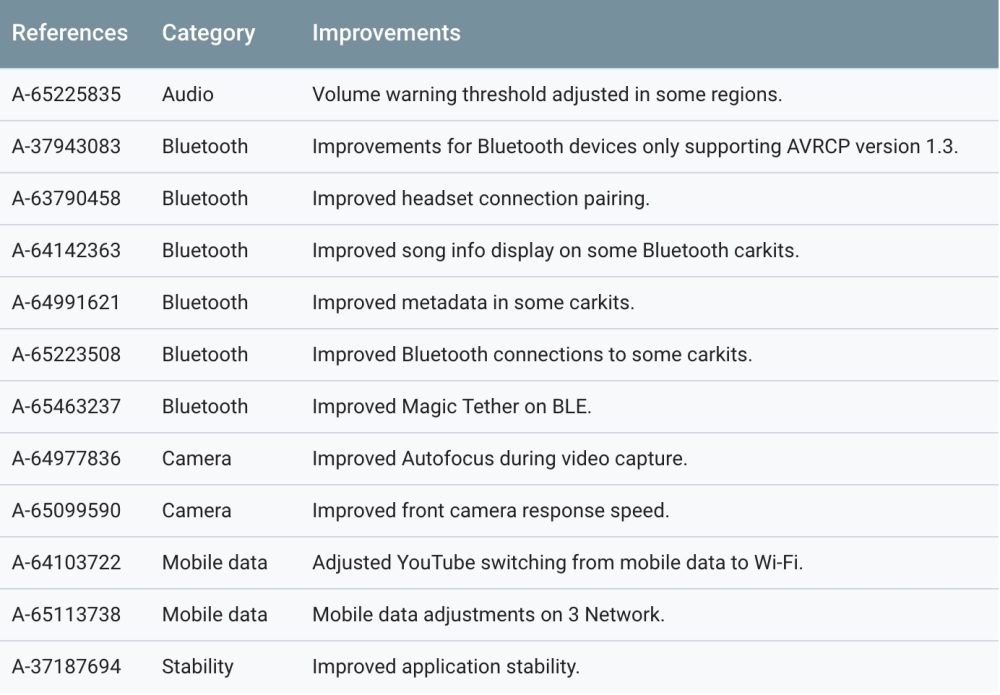 Each entry includes a description of the “Improvements” and a category, like Audio, Bluetooth, Camera, Mobile data, and Stability. There are also reference numbers, though it does not correlate to any publicly accessible bug tracker.