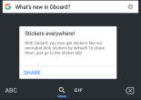 <string name=”feature_card_stickers_everywhere_description”>With Gboard, you now get stickers like our animated blob stickers by default! To share them, just go to the sticker tab!</string>