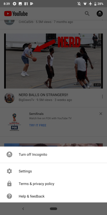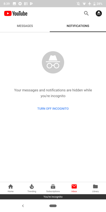 The Home and Trending feeds are the only parts of the app accessible when Incognito is turned on. Subscriptions, Inbox, Library, and Search remind you how content is hidden and that nothing is being saved to your history. If you want to add a video to a playlist when private, a button will appear at the bottom to quickly “Turn off Incognito” while keeping your position watching the clip.