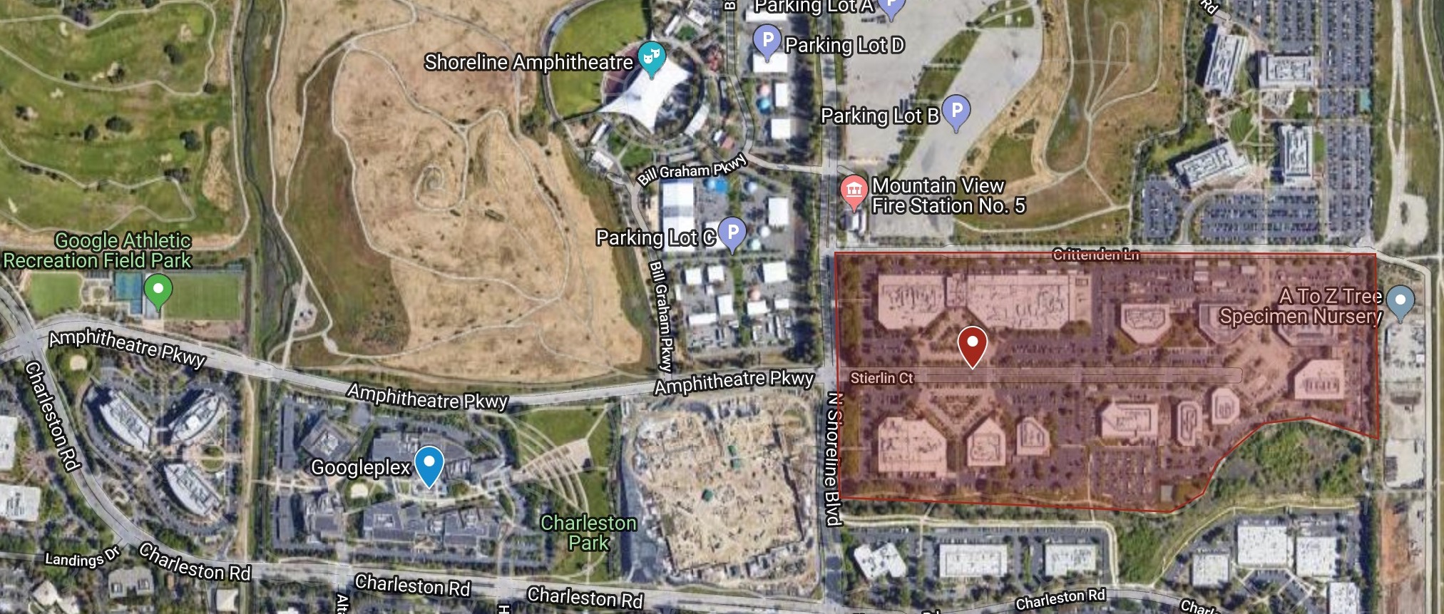 It consists of 12 structures ranging from one to two stories, with Google already the primary tenant of the campus. The buildings are circled by ample and inefficient parking space that developers note is ripe for development.