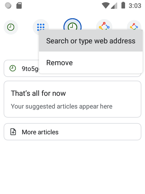 Otherwise, there does not yet seem to be a way to choose your own web address to navigate to. There’s no address bar anywhere to be seen. Thankfully, this doesn’t seem to be an intentional choice by Google, to somehow dumb down Chrome, as doing a long-click on any of the menu items reveals “Search or type web address.” For now, though, this menu option does nothing.