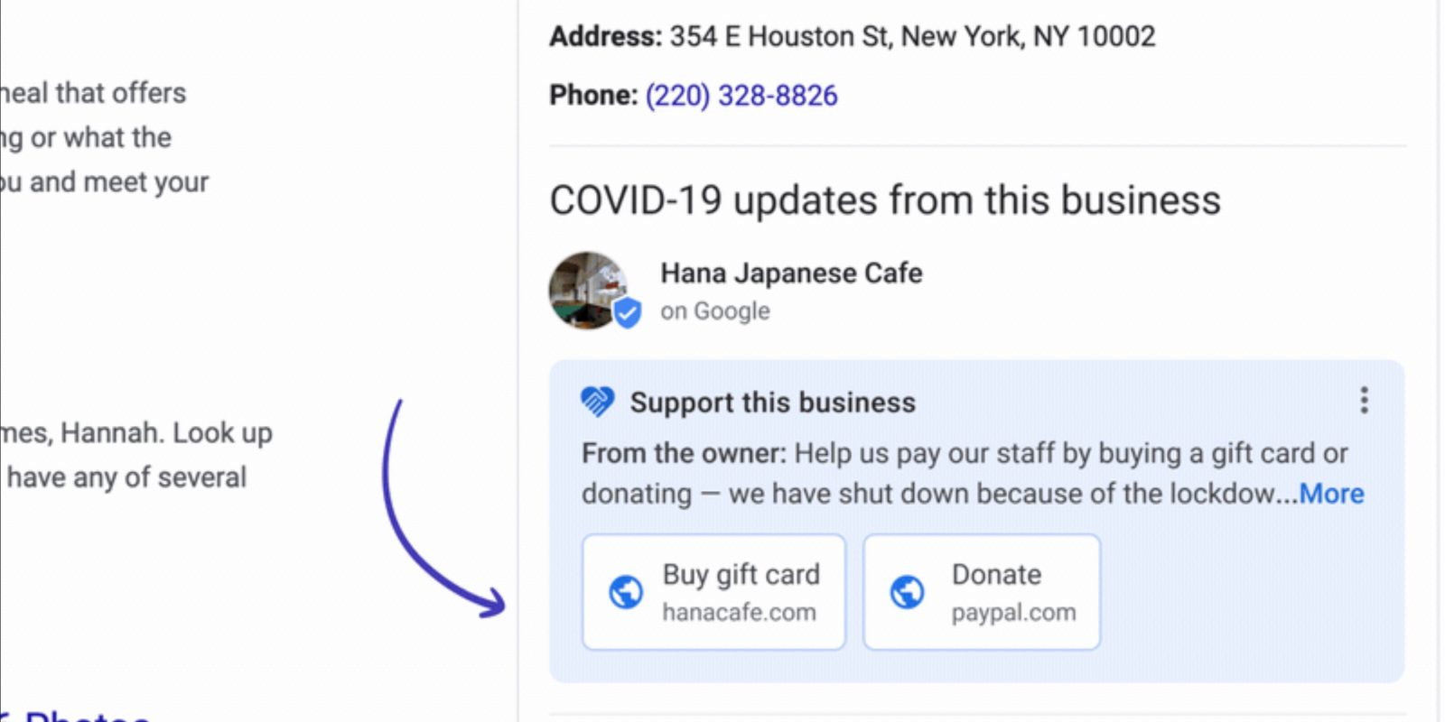Update 5/27: After letting businesses add donations and gift cards earlier this month, Google is now starting to surface those links to consumers. In Search and Maps, it takes the form of a blue “Support this business” with a description “from the owner” on how exactly you’d be helping. Below are two large buttons linking to the resources.