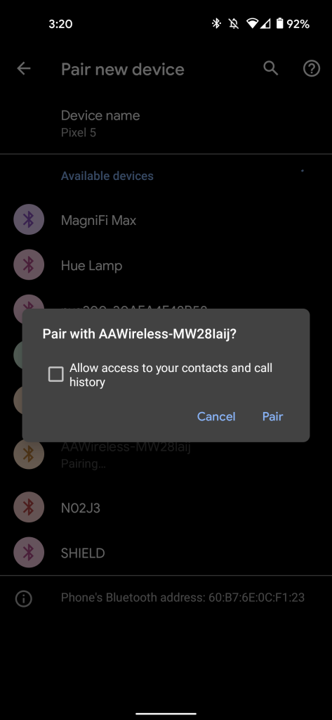 AAWireless plugs into your car’s USB port, just like the phone normally would. In my Subaru Crosstrek with its stock infotainment system, things worked without a hitch. During the first setup, the device takes a few moments to turn on, then you pair with it over Bluetooth as you would a pair of wireless earbuds. From there, setup is just like a normal Android Auto experience.