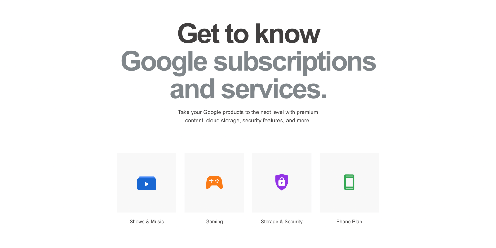 Joining the Pixel, Nest, Stadia, and Pixelbook product lines at the top of the Google Store today is a “Subscriptions” page. (This addition interestingly comes at the expense of Accessories.) The offerings are broken down into four categories: