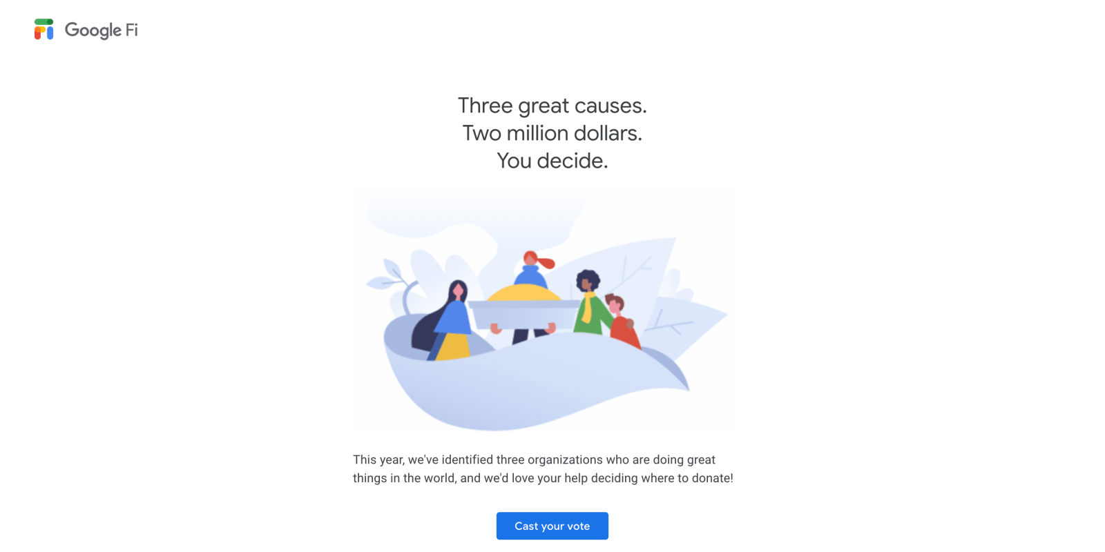 In lieu of hardware or Play Store credit, the 2020 Google Fi holiday gift will let subscribers vote on how $2 million in donations is dispersed among three charities.