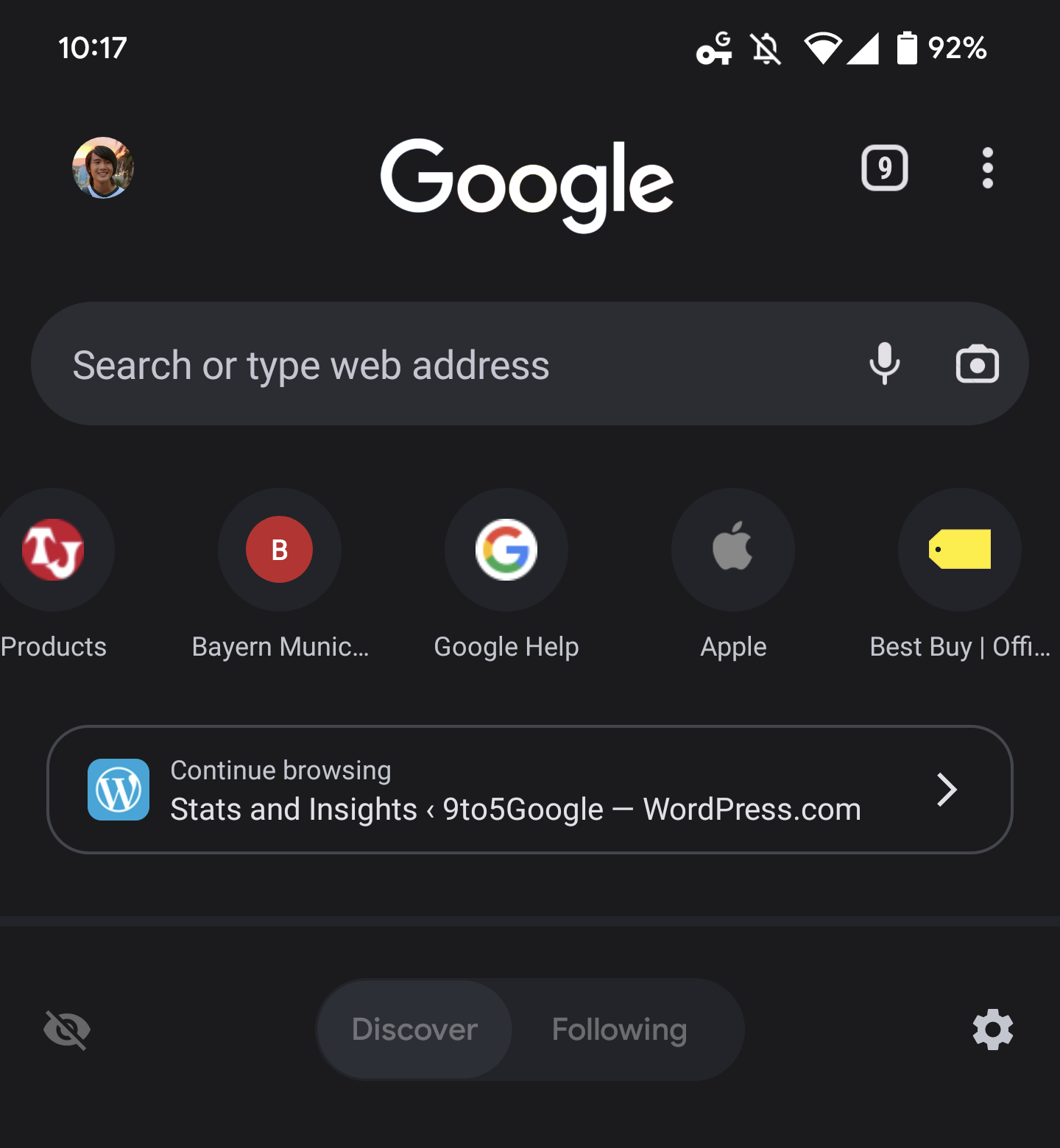 When opening Chrome after some time away from the browser, Google shows a modified version of the New Tag Page. The company logo is smaller, while the address bar is much higher with a carousel of recently listed sites (as favicons) below. There’s a “Continue browsing” shortcut and feeds for Discover/Following below.