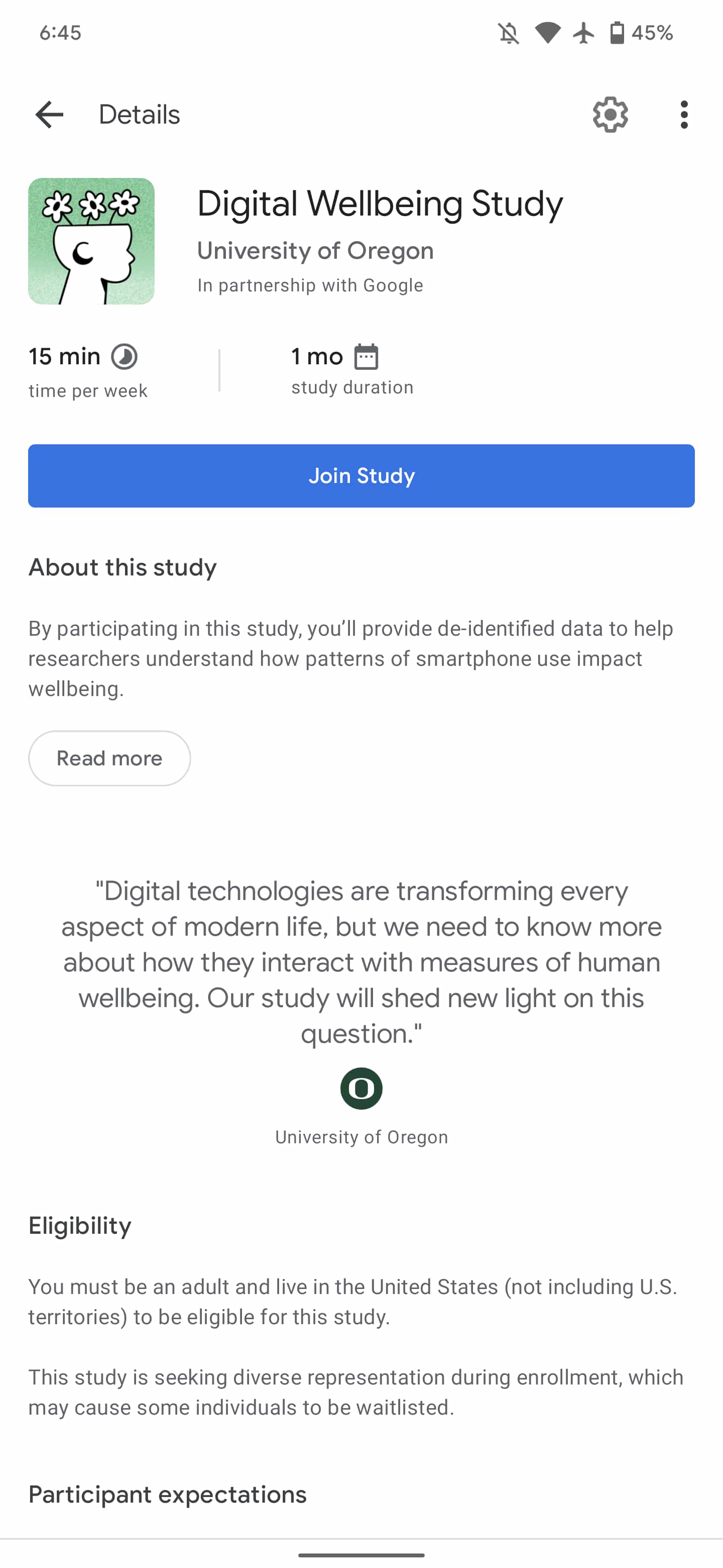 This study is open to adults based in the US that have an Android phone and “can complete daily activities without assistance.” It takes four weeks. Fitbit users can optionally add relevant step count and physical activity data, with the company possibly analyzing this data to “improve certain Fitbit features.” After joining, it takes a month to complete and takes up about 15 minutes of your time every week.