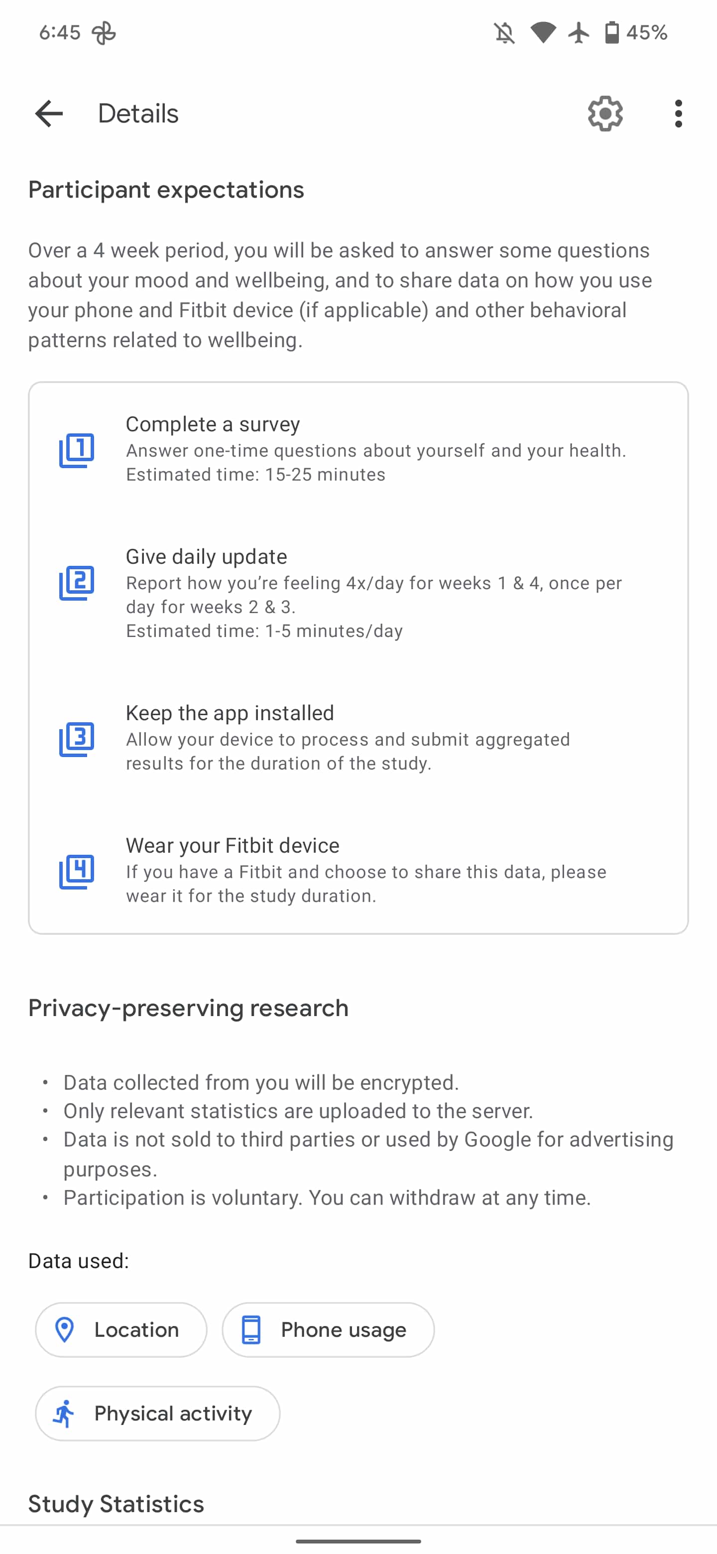 - Keep the app installed: Allow your device to process and submit aggregated results for the duration of the study.