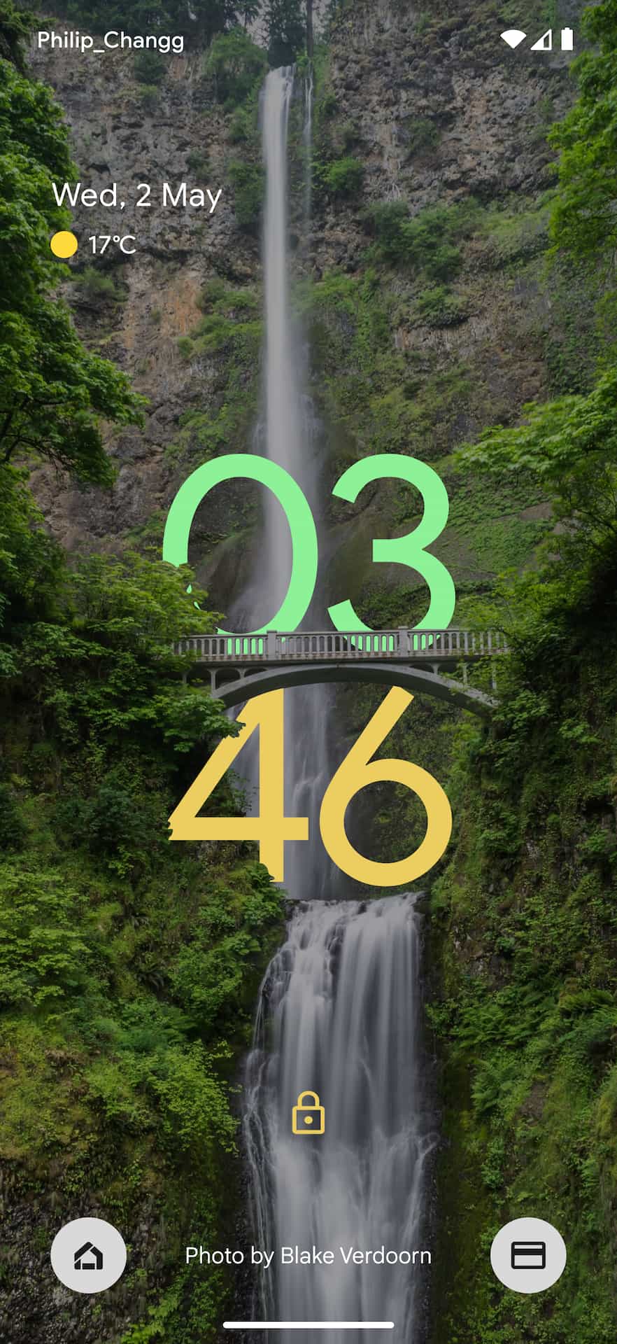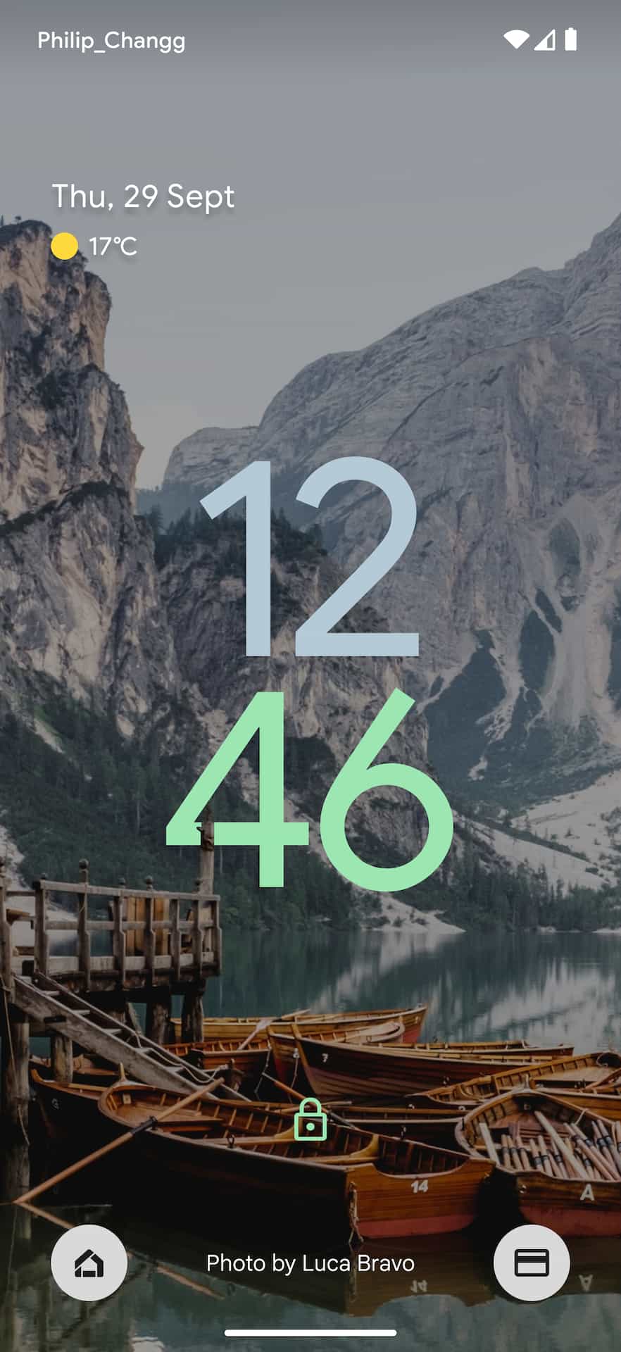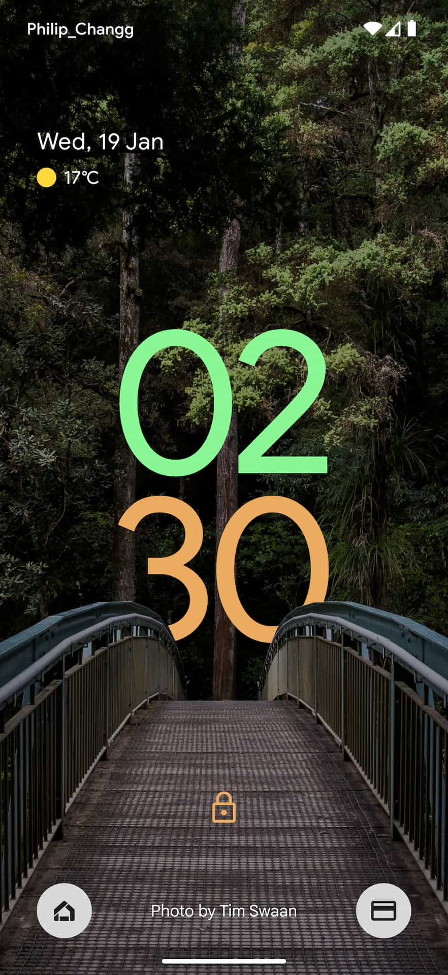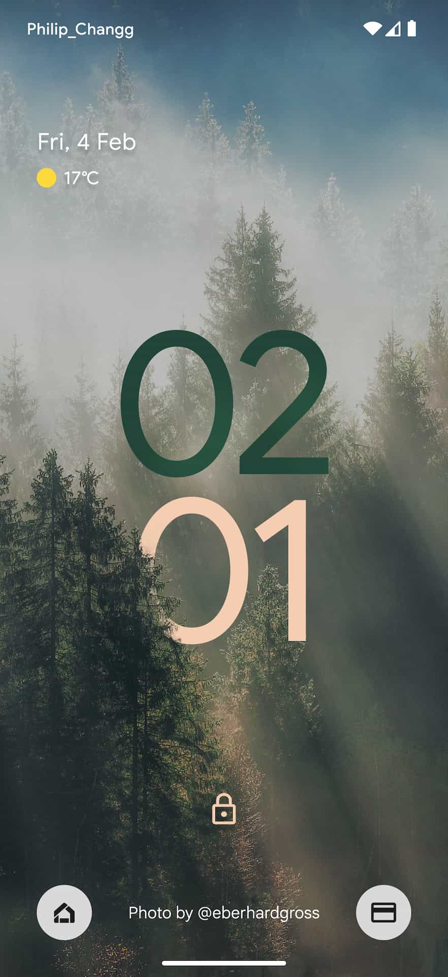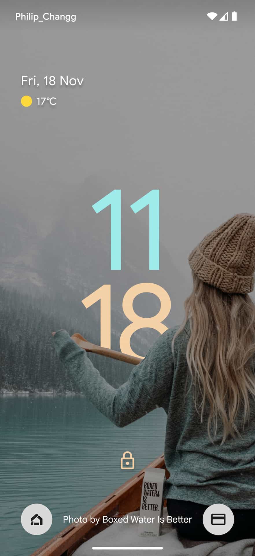 The Android lockscreen on Pixel phones today starts with the day/date in the top-left corner, while weather (condition and temperature) is underneath. Above this At a Glance widget is Android’s status bar where the carrier is noted at the left and the right shows battery percentage and connection statuses. At the bottom of the lockscreen, you get a shortcut to open smart home controls and Google Pay (soon Google Wallet).