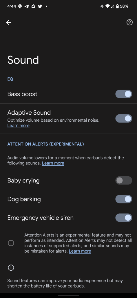The worse removal here is easily Attention Alerts, an experimental feature that was added to the original Pixel Buds after launch in its first Feature Drop and could alert you to important sounds while you’re jamming out. A baby crying, a dog barking, or a passing siren could trigger an audible alert on the earbuds and lower the music temporarily. These features are completely gone on Pixel Buds Pro, and I can’t fathom why. With Active Noise Cancellation and longer battery life in the mix, Attention Alerts feel even more useful, and I actively miss them.