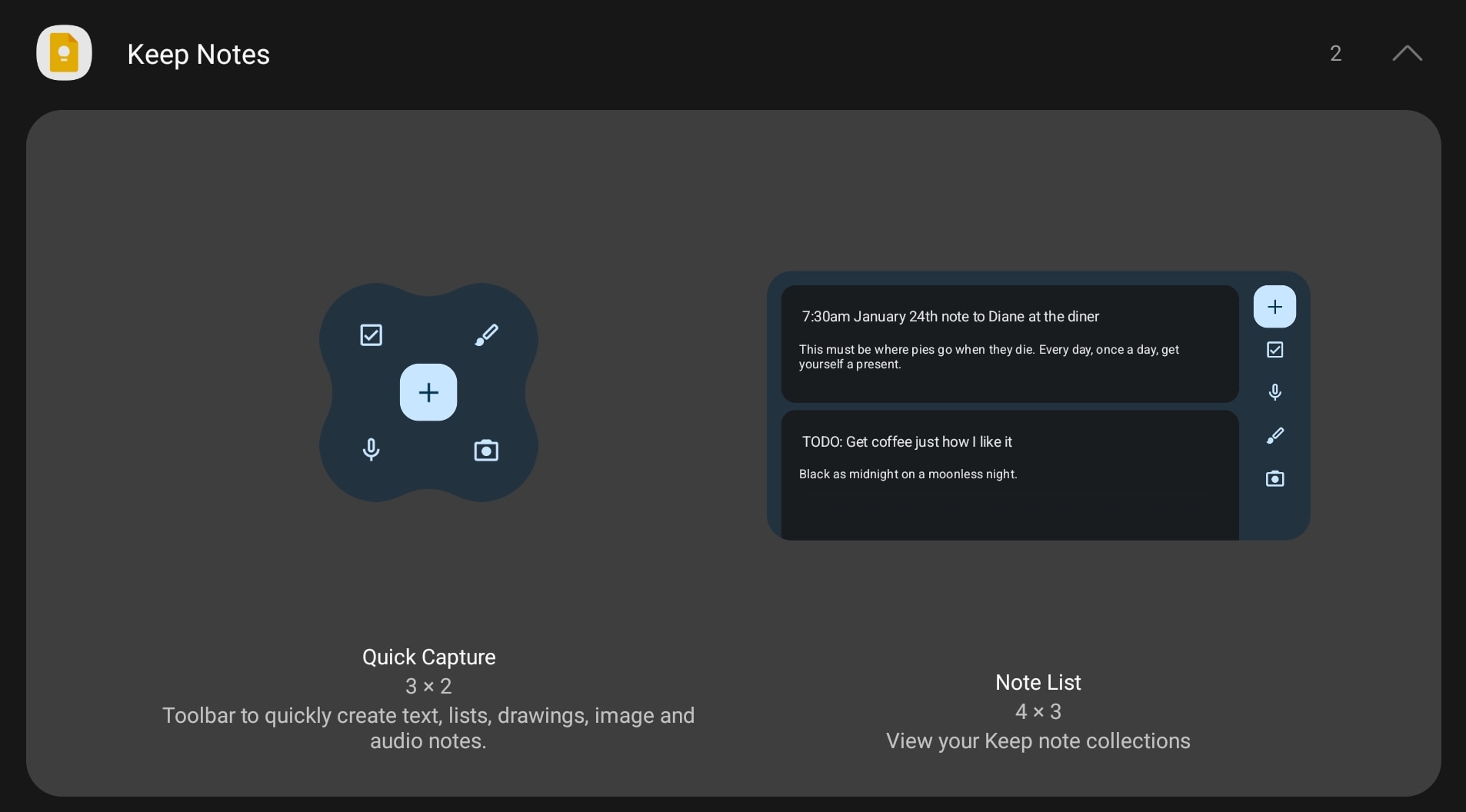 Meanwhile, the Google Keep widget switches from a right rail to a bottom bar of sorts. Shortcuts to create a checklist, voice memo, drawing, and picture note appear at the very bottom, while a FAB (floating action button) is used for text. A scrollable list of notes is above it and this design is very similar to Gmail’s widget.