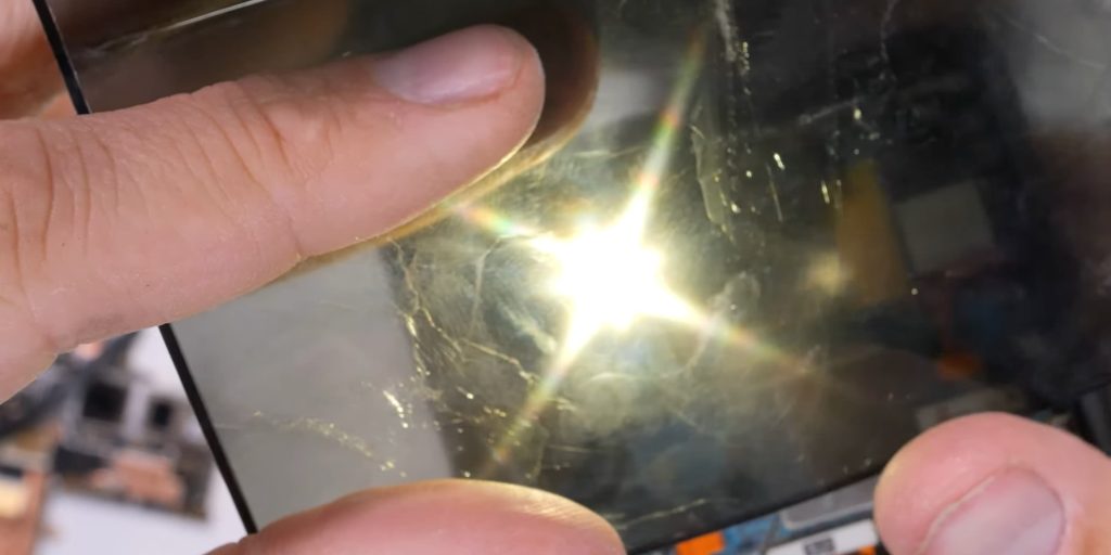 This teardown removes the foldable display, starting by peeling off the black bezel surrounding the component. We see the ultrathin glass (UTG) crack when pinched.