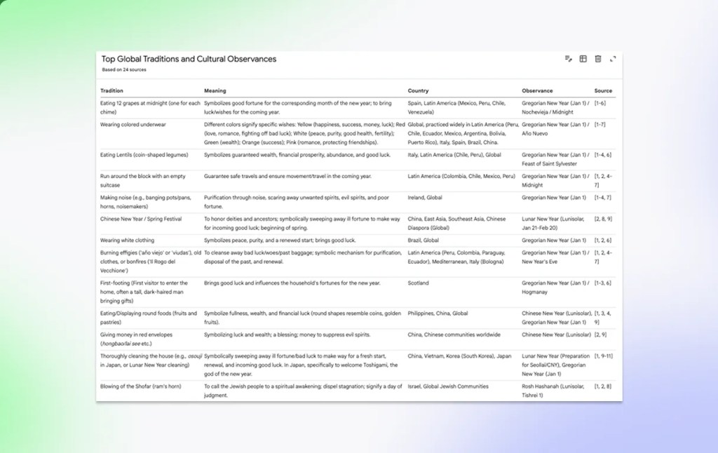 Google “synthesizes your sources into clean, structured tables” that can then be exported into Google Sheets. Example use cases include: