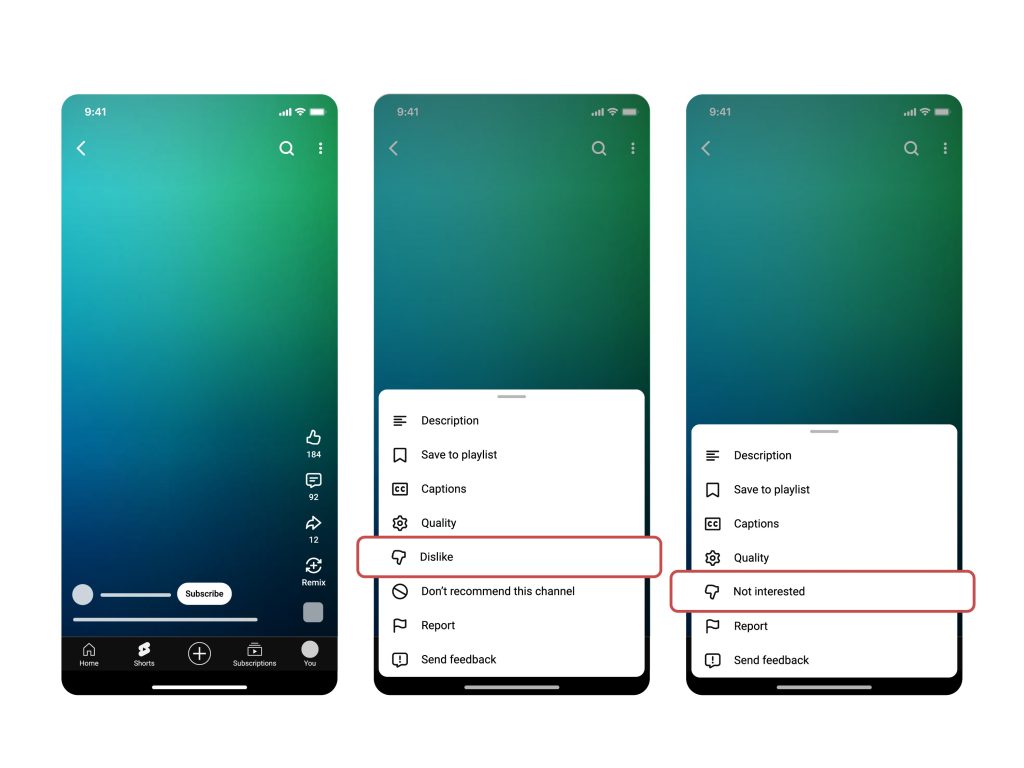 Hiding dislike functionality might be frustrating enough for some users, but it’s not the only change being tried out here. While some people will see “Dislike” alongside “Not interested,” others will see the two options combined, showcasing “Not interested” phrasing next to the usual thumbs-down iconography.