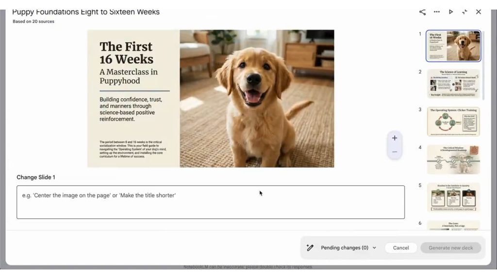 Meanwhile, NotebookLM-generated slides (on the web) now support Prompt-Based Revisions. Open the deck in the Studio panel and tap the pencil icon next to the title. You’ll get a fullscreen interface with a “Change Slide 1” prompt box to let you edit text, color, visuals, and more. Make all the edits you want and tap “Generate new deck” in the corner. This feature is now rolled out to all NotebookLM users.
