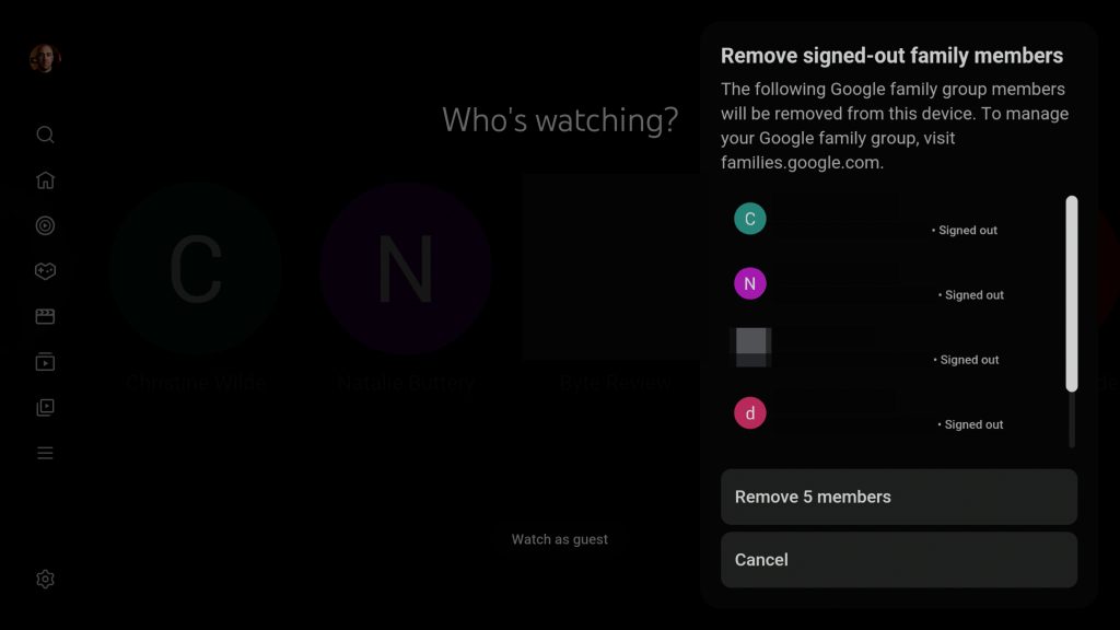 The following Google family group members will be removed from this device. To manage your Google family group, visit families.google.com.