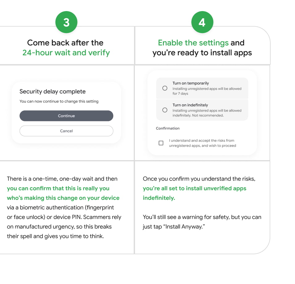 This “advanced flow” is for power users and enthusiasts who “want to take educated risks to install software from unverified developers.” Google says it was “designed carefully to prevent those in the midst of a scam attempt from being coerced by high pressure tactics to install malicious software.”