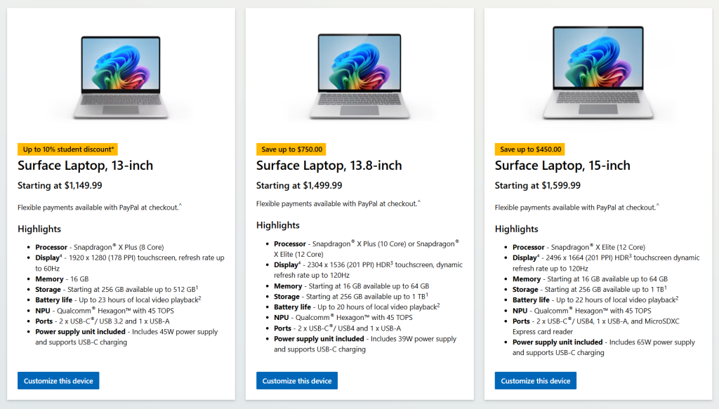 The Surface Laptop (7th generation) and Surface Pro (11th generation) were released in 2024 as the first Microsoft machines powered by Qualcomm’s new Snapdragon X chips. Both products started at $999. A price hike of sorts hit in 2025 when Microsoft ditched the lowest storage tiers, pushing the starting prices to $1,199 for a Snapdragon X Plus-powered machine with 16GB of RAM and 512GB of storage.