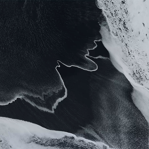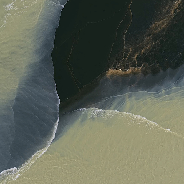 Streaming waters swirl and flow through curving, rugged landscapes.