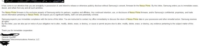 In case there was any doubt in your mind that the Samsung Nexus Prime existed and was on its way into consumers’ hands, Samsung’s legal team appears to be confirming it with a Cease and desist letter. The letter says that the Nexus Prime Firmware is exclusive property of Samsung. Interesting.