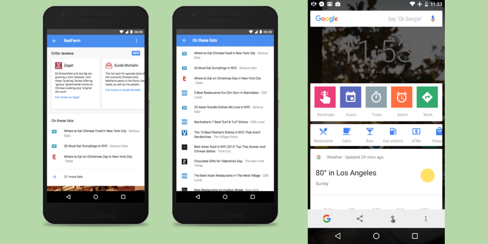 Following improvements to Google Maps that surface interesting locales, Google Search is now showing restaurant reviews from top critics and what best-of lists (from various publishers on the web) a place has been mentioned in. In related updates, the latest Google app beta now shows weather and stock cards when triggering Now on Tap from the homescreen.