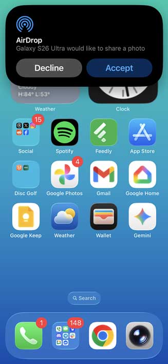 On the iPhone side of things, things are essentially just as easy. Once the phone is set to recieve from everyone, they’ll see a notification with the option to accept your shared file. Hitting Accept finishes the process.